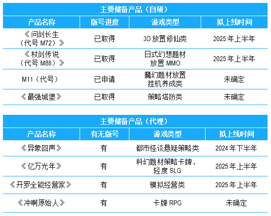 公司储备多款新品,,,期待为玩家解锁更多新鲜体验,,,部分产品如下表所示:::
