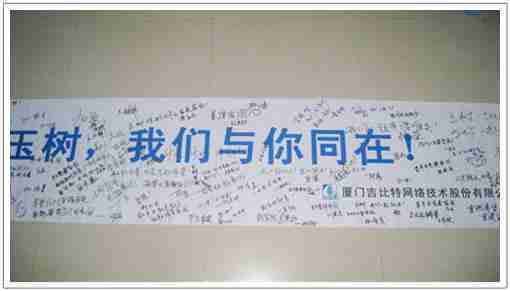 在募捐现场,,,,J9.COM同学们怀着沉重的心情,,,将每一笔捐款投入募捐箱,,,并在现场设置的横幅上,,,,写上了对玉树人民的深情祝福。。。满载J9.COM祝福的横幅将和捐款一起抵达玉树,,,,希望谨以此微薄之意,,,为玉树人民带去J9.COM的爱心与祝福,,,,希望吉祥、、、、幸福的阳光能早日驱散灾难的阴霾,,,普照在玉树人民的身上,,,鼓励他们坚强、、、勇敢与乐观。。。