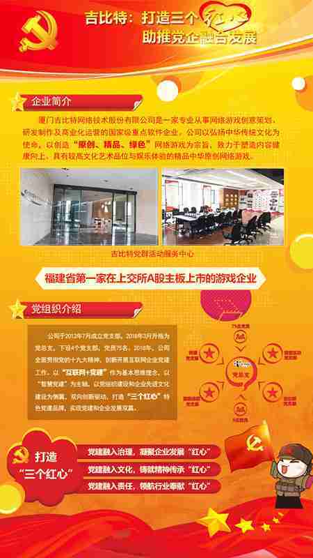 未来公司将全面学习贯彻习近平新时代中国特色社会主义思想和党的十九大精神,,,,持续强化“互联网+党建”的思维理念,,,,以“智慧党建”为主轴,,以党组织建设和企业先进文化建设为侧翼,,,双向创新驱动,,引领有信仰、、有情怀、、、有价值的新时代游戏研发运营,,,在不断发展壮大的同时,,,成为行业的“红色标杆”,,实现党建和企业发展双赢。。。